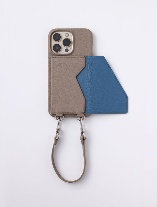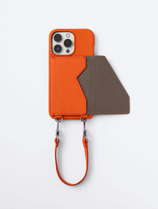 洗練された見た目と使い勝手に優れたiPhoneケース。本体7色×ポケット9色×ハンドストラップ14色のカラー展開からカスタムできます。背面カードポケットのインナーカラーがアクセントに。上質なレザーと、洋服のポケットにもスッと収まる薄さで、スマートかつユニセックスなデザイン。取り外しできるハンドストラップは落下防止にも。